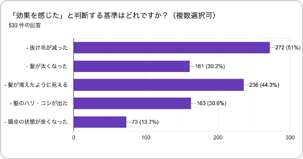 3.「効果」の判断基準は、「抜け毛の減少」と「髪が増えたように見える」