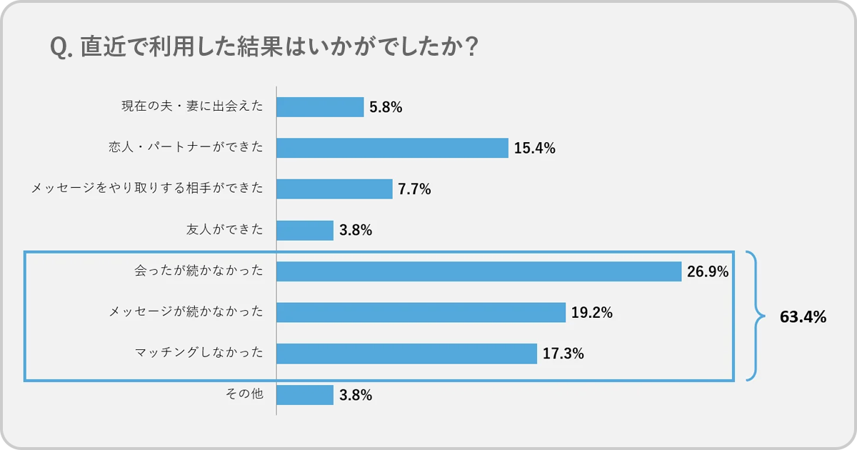 40代以上のマッチングアプリ利用者のうち、約63.4%は利用結果に満足していないことが分かりました。