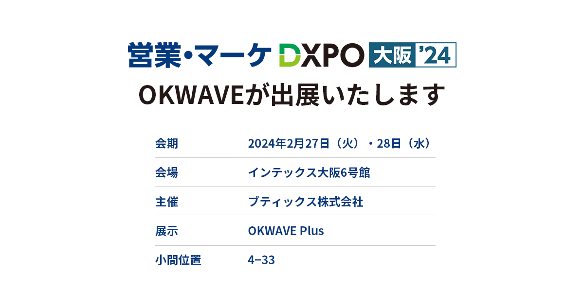 「世界中のありがとうの物語を蓄積し可視化する」をパーパスとし、法人・個人向け製品サービスを展開する株式会社オウケイウェイヴ(所在地:東京都渋谷区、代表取締役:杉浦 元、以下「オウケイウェイヴ」)が運営する『OKWAVE Plus』が、2024年2月27日(火)~2024年2月28日(水)にブティックス株式会社が主催する「営業・マーケ/広告・販促/店舗・EC DXPO大阪’24」に出展いたします。