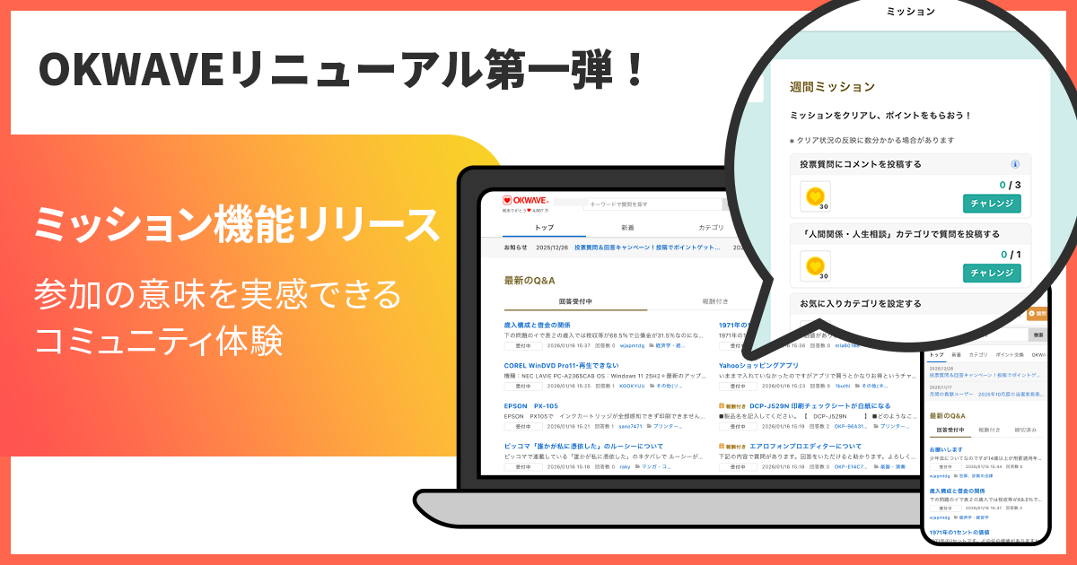 「世界中の“ありがとう”の物語を蓄積し可視化する」をパーパスとし、法人・個人向けコミュニティサービスを展開する株式会社オーケーウェブ(本社:東京都港区、代表取締役:杉浦 元、以下 オーケーウェブ)は、Q&Aコミュニティ『OKWAVE』において、ユーザーの参加と貢献をより分かりやすく可視化する「週間ミッション」機能をリリースしました。